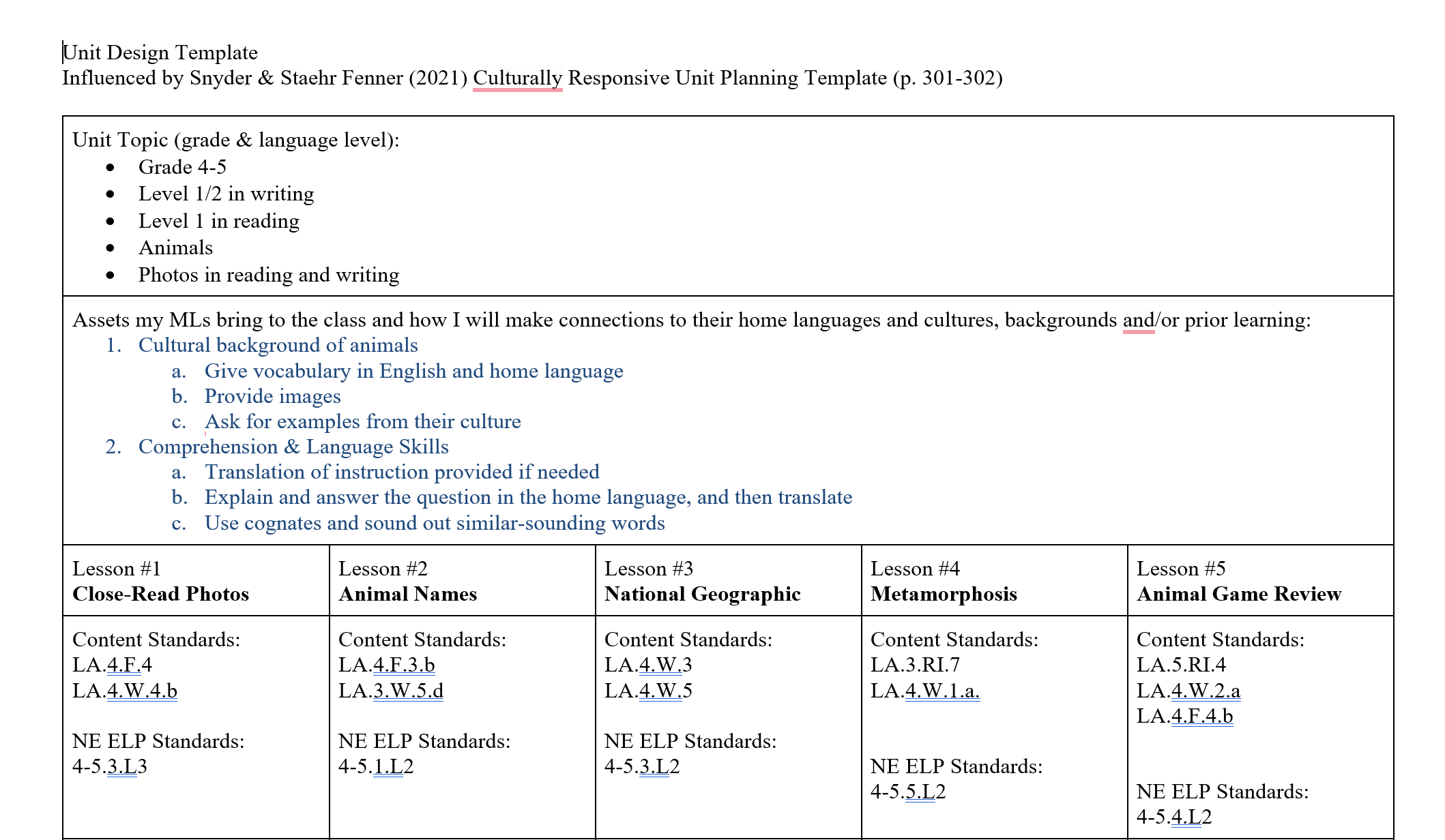 | Resources Used: Books: 2. Snyder, S. & Staehr Fenner, D. (2021). Culturally responsive teaching for multilingual learners: Tools for equity. Corwin. Websites: - Canva Mini Lesson - Using photos in reading & writing - Wildlife "I Have, Who Has" Game - PreKinders Preschool Activities My Notes:
